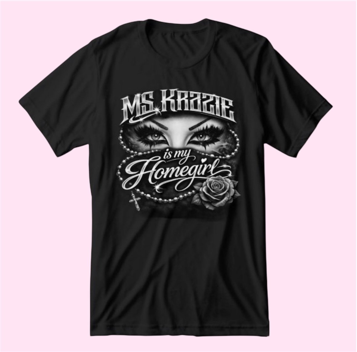 LIMITED EDITION "Ms Krazie Is My Homegirl" original design featuring the ICONIC Ms Krazie eyes with her dramatic OG cholita meets goth signature eye makeup. Very Y2K early 2000s inspired, a must have for your chicano rap collection!